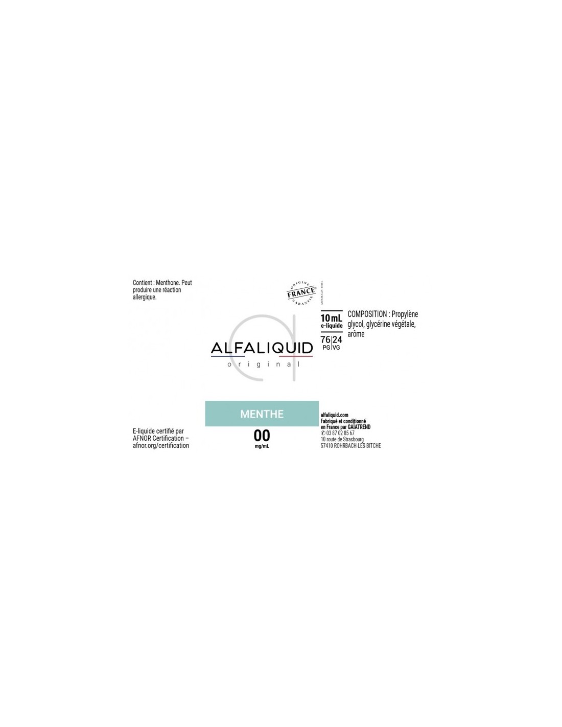 Menthe de la gamme Fraîcheur Alfaliquid Original est E-liquide certifié par AFNOR Certification – Conforme à la norme volontaire XP D90-300-2 – afnor.org/certification.