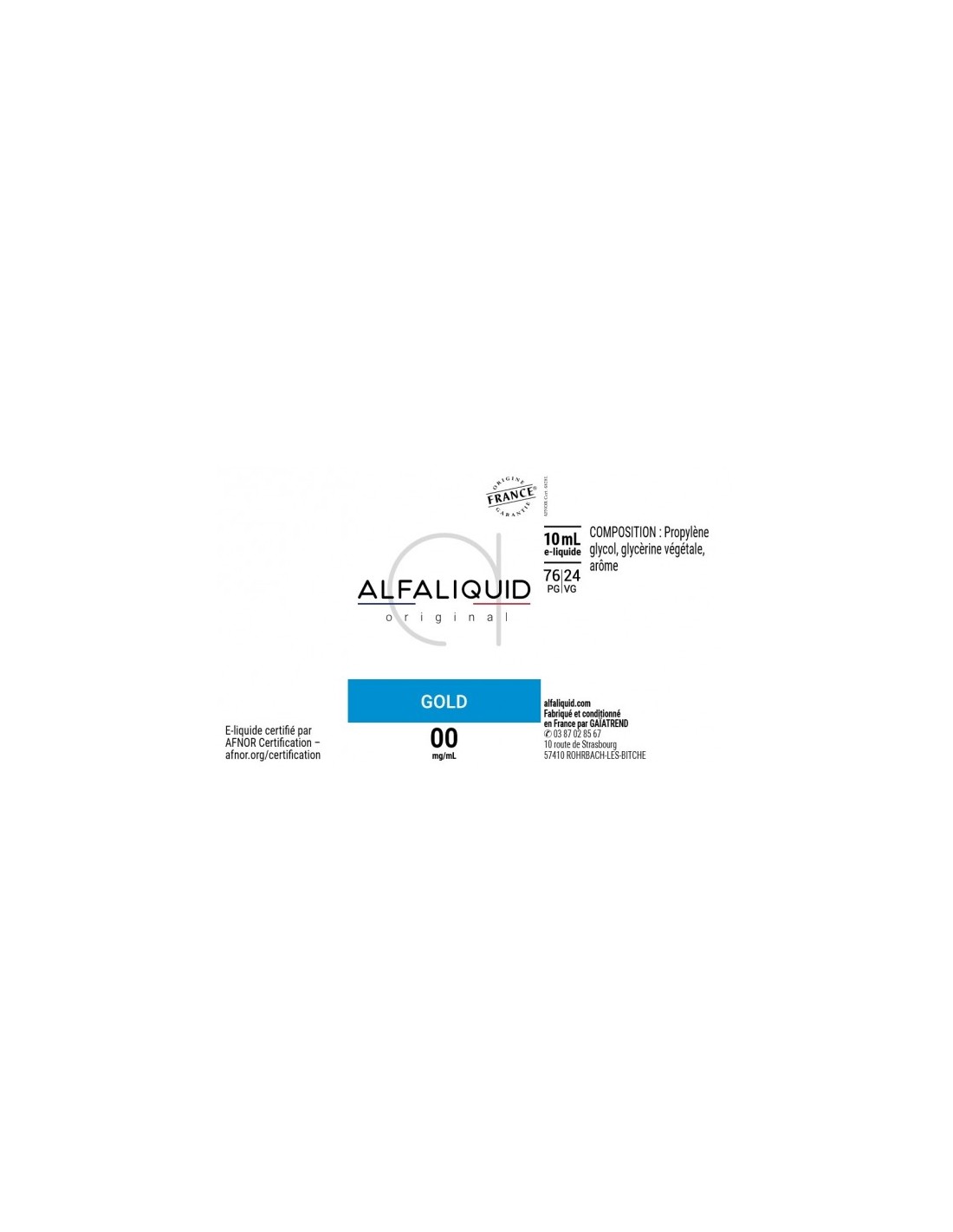 Gold, ainsi que l'ensemble des saveurs Alfaliquid, est certifié Origine France Garantie. Cette certification assure aux consommateurs une production 100% française. Gaïatrend, société fabricante des produits Alfaliquid a également obtenu en janvier 2018, la conformité HACCP qui garantit les plus hauts standards de qualité et de sécurité des e-liquides selon la norme NF V01-006.